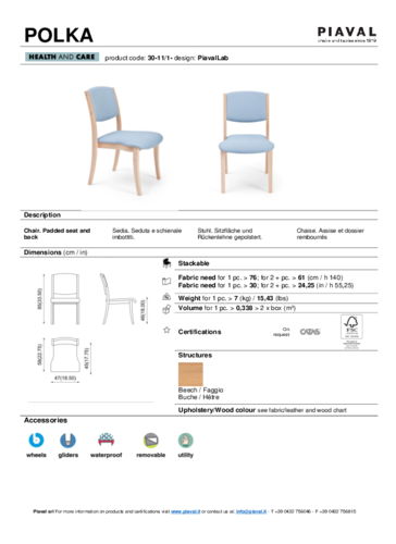 Odolná židle POLKA 30-11/1 oplývá rozvlněnými tvary, které vám okamžitě vykouzlí úsměv na tváři. Zároveň je díky prvotřídnímu zpracování materiálů také mimořádně vhodná i do vysoce zátěžových prostor. Konstrukce židle je zhotovena z bukového dřeva v různých odstínech moření. Vykrojená podnož je zakončena dle výběru kluzáky nebo kolečky pro snadnější manipulaci. Model je stohovatelný - doporučujeme přiobjednat praktický přepravní vozík. Měkce čalouněný moderně zaoblený opěrák a sedák nabízíme v textilu dle vzorníku nebo vaší vlastní dodané látce. Židli POLKA si tak můžete dokonale personalizovat dle osobního vkusu a potřeby. Na dotaz lze k tomuto modelu dodat odnímatelný sedák pro neprodyšné varianty látek nebo voděodolný ochranný film na sedák. Pro více informací kontaktujte naše specialisty, kteří vám poskytnou detaily o všech doplňcích a pomohou vám sestavit kousek přesně podle vašich představ.