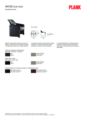 Salónkové křeslo AVUS od italské značky PLANK je charakteristické pohodlnou skořepinou s polyuretanovou pěnou se schopností zpomalit případné hoření. Tento designový kousek je čalouněný pravou kůží ve dvou barevných variantách a vynikne například v hotelovém salónku. Opěrák je vždy lesklý a podnož matná. Za příplatek lze dodat také kluzáky na podnož, pro více informací se na nás neváhejte obrátit.