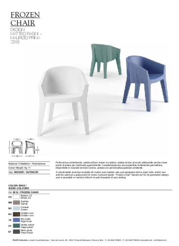 FROZEN je kolekce, která čerpá inspiraci z království ledu a zachovává si jeho úžasné vlastnosti. Židle, barové stoličky, lampy i barové pulty, které má na starosti designérské duo Matteo Ragni a Maurizio Prina, se vyznačují čistými liniemi a kvalitním zpracováním. Výrobky v této řadě se pyšní barevnými provedeními a některé kousky jsou k dispozici i v osvětlených verzích a mohou být vybaveny speciálním příslušenstvím podle konkrétních potřeb.