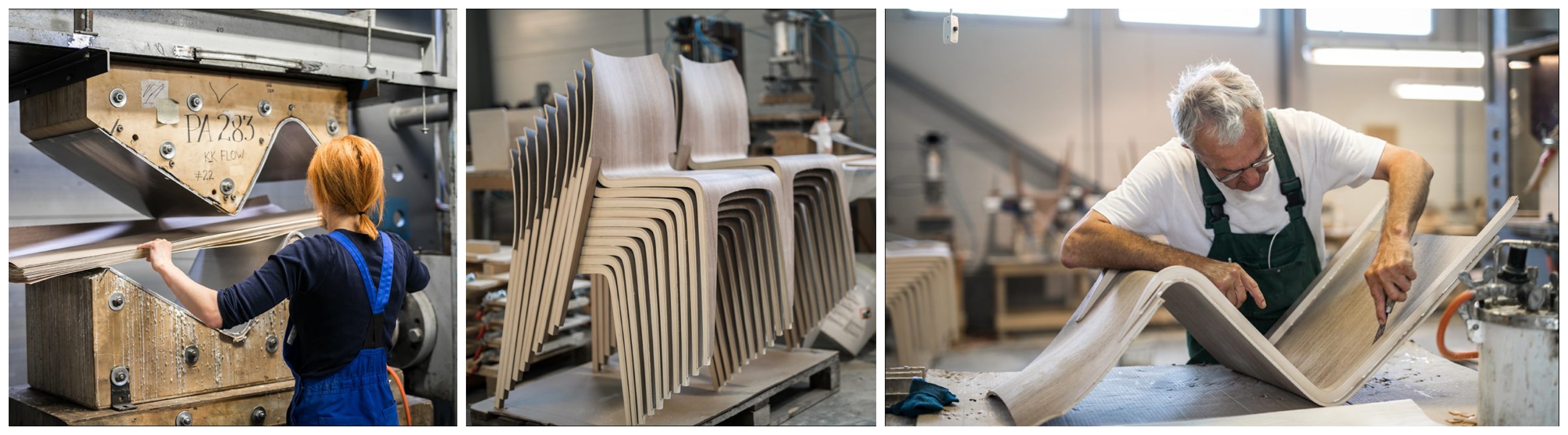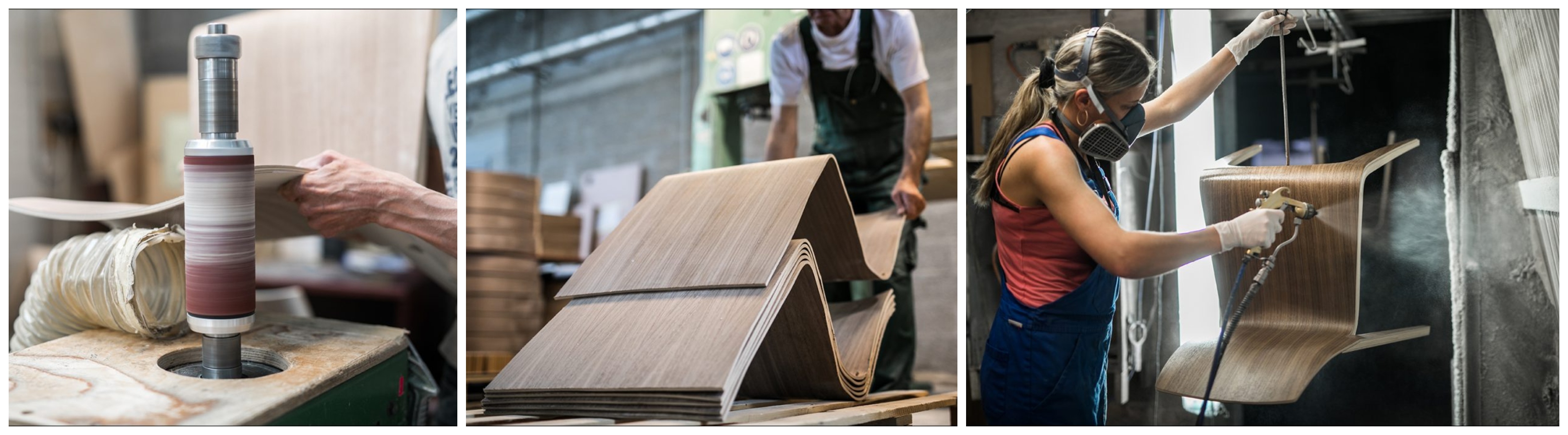 Nábytkové části se vyrábějí lepením několika vrstev překližky v elektrických nebo vysokofrekvenčních lisovacích formách. Vrstvy se kladou na sebe tak, aby vlákna byla buď kolmá nebo podélná, na základě potřeby konkrétního produktu a jeho designu. Vnitřní vrstvy tvoří březová překližka různých tlouštěk - od 0,5 mm do 1,5 mm. Povrchové dýhy mohou být z břízy, dubu, laminátu, ořechu a dalších typů dřevin. Židle nebo detaily nábytku lze povrchově upravovat různými způsoby - mohou se lakovat, bělit, mořit nebo tónovat v kterémkoli z odstínů NCS.