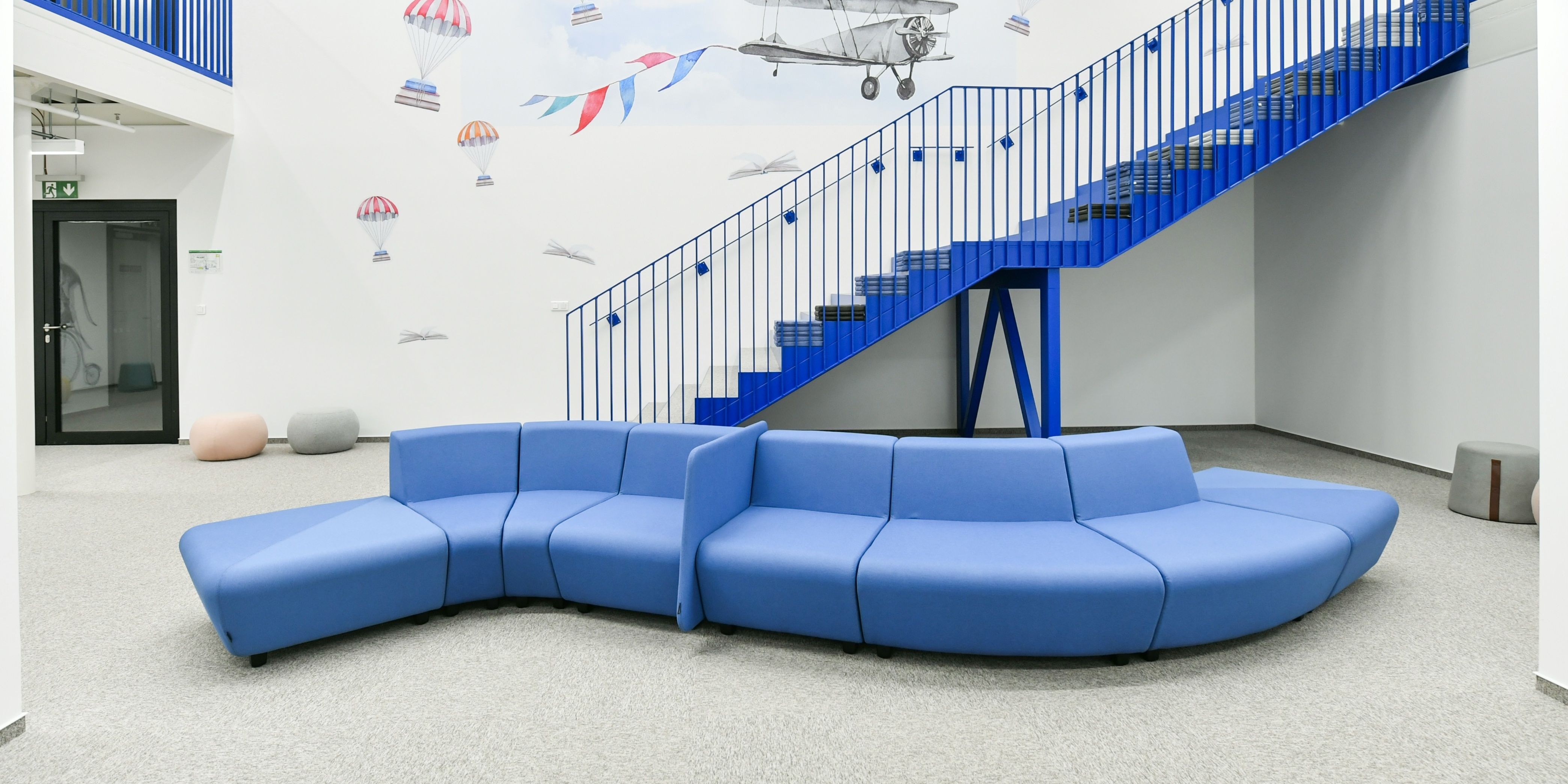 Místem pro odpočinek žáků i učitelů se stala modrá modulová sedací souprava SOFT ROCK. Tvoří organickou vlnovku, která barevně ladí se zábradlím schodiště a dalšími propracovanými detaily. Její výhodou je, že si díky dostupnosti různých sedacích prvků i područek mohli pohrát s jejím tvarem tak, aby perfektně zapadl do vzdušné chodby.