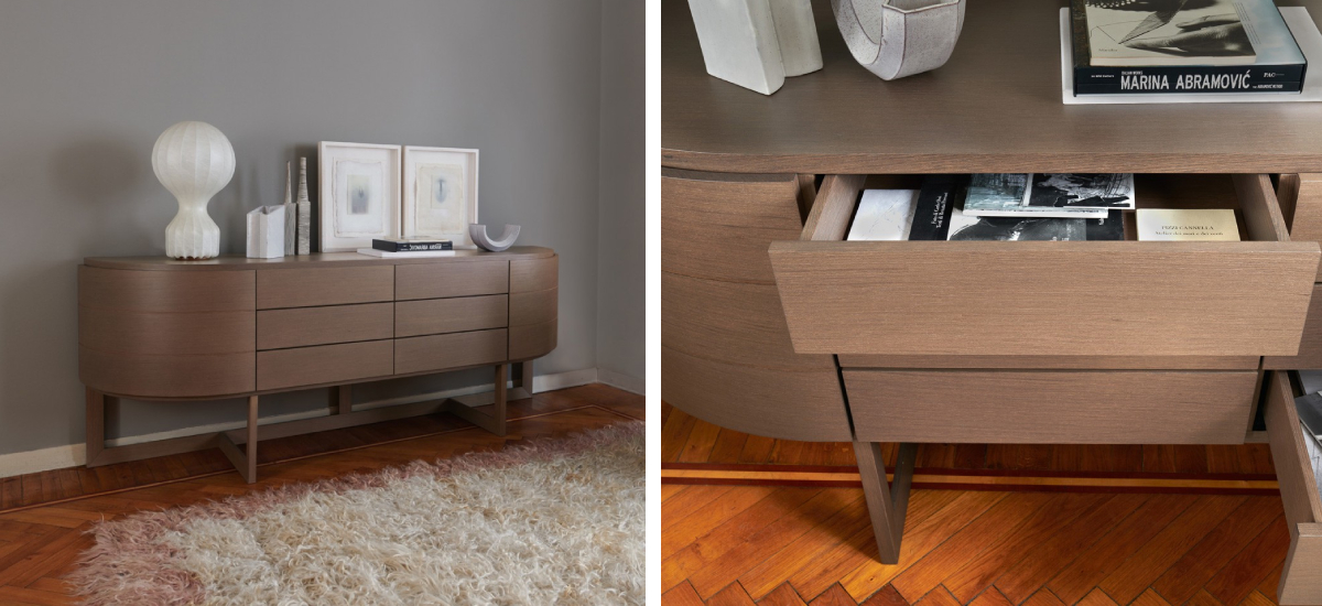 Elegantní skříňku Diva, která se vyznačuje vyznačuje hrou jemných protikladů, navrhl designér Alexander Lorenz. Horní zaoblená část skříňky kontrastuje s grafickou podnoží. Dubová konstrukce v několika dostupných variantách nabízí dvě zakřivené boční skříňky a šest centrálních zásuvek s otevíráním push & pull. Tento kousek nabízí neotřelé tvary, které dodají každému interiéru honosnost.