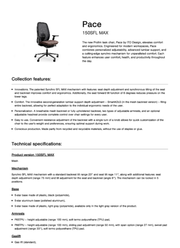 Moderní pracovní židle PACE, navržená studiem ITO Design, přináší špičkový komfort, intuitivní ovládání a maximální přizpůsobení. Díky pokročilému synchronnímu mechanismu, individuálně nastavitelné bederní opěrce a důrazu na ergonomii se dokonale přizpůsobí vašemu tělu během celého pracovního dne.