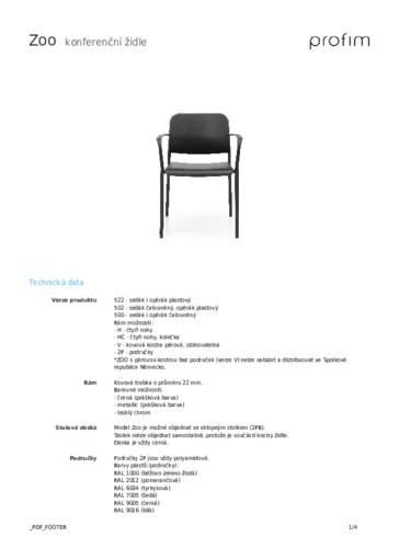 Konferenční židle ZOO 522, která získala nejprestižnější ocenění ve světě designu - RED DOT Award 2015. Barvy plastů lze v rámci sedáku, opěráku a područek libovolně kombinovat. Čtyřnohou podnož nabízíme také v provedení s kolečky. Základní odstíny jsou černá, metallic, světle šedá a chrom. Židli lze objednat ve variantě s polyamidovými područkami nebo bez područek. Přikoupit si můžete široké množství doplňků, jako např. praktický sklopný stolek nebo různé druhy spojovacích systémů. Manipulaci s židlemi usnadní dokoupitelný vozík. Kluzáky židle nabízíme filcové nebo teflonové dle typu podlahy.