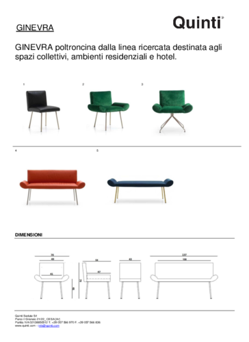 Řada GINEVRA nabízí čalouněné židle, sedačky i lavice, které se vyznačují měkkými a sofistikovanými tvary, vhodnými pro společenské, obytné i hotelové prostředí. Díky svým kompaktním rozměrům, designu područek a možnosti přizpůsobení jsou produkty kolekce vždy elegantní a na úrovni. Skvěle se mezi sebou kombinují a vytvářejí z obyčejného prostoru luxusní koutek italské elegance. O tuto jedinečnou řadu se pro společnost Quinti zasloužil renomovaný designér Roberto Baciocchi.