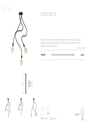Nemůžete si vybrat mezi tradičními typy osvětlení a hledáte něco speciálního? Stropní osvětlení LOYD E27 III spojuje praktičnost a také vizuálně atraktivní a minimalistický design, který bude slušet každému modernímu a stylovému interiéru bez výjimky. Světlo LOYD je opatřeno třemi ohybnými rameny, které umožňují zcela flexibilní nastavení. Můžete nejen nastavit proud světla na konkrétní bod, ale dodat světlu i originální vzhled, který ještě více umocníte, pokud světlo doplníte o tvarově zajímavé, například vintage žárovky. Ozvláštněte svou jídelnu, obývací pokoj, ložnici nebo různorodé typy komerčních a veřejných prostorů se světlem LOYD a užívejte si jeho jedinečnost a výjimečnou atmosféru.