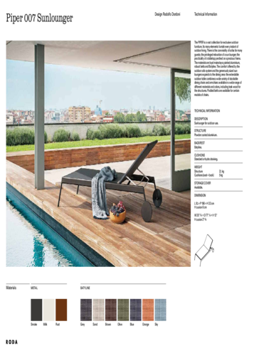 Moderní lehátko PIPER je velmi variabilním a stylovým doplňkem, který uspěje v každém prostoru, ať už na zahradě, verandě, terase, u bazénu nebo i na balkoně. Díky lehké konstrukci z práškovaného hliníku a 2 velkým kolečkům lze s lehátkem snadno manipulovat a může jej proto obsluhovat úplně každý. Zkosená podnož dodává lehátku PIPER velmi současný look. Konstrukci lze vybrat ve světlém, tmavém nebo rezavém provedení. Hlavová část je samozřejmě polohovatelná pro vaše maximální pohodlí. Lehací plochu tvoří strukturovaná látka s odolností typickou po všechny textilie značky RODA. Dostupná je v 7 barevných provedeních. Jaké se líbí vám?
