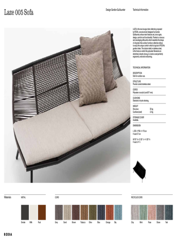 Designová čalouněná sedačka LAZE je dalším příspěvkem do mimořádně kreativního portfolia značka RODA. Na svědomí ji má designér Gordon Guillaumier, který i v tomto případě využil variability a hravosti provazů. Sedačka stojí na moderně zkosené čtyřnohé podnoži vyrobené z práškované nerezové oceli. Na výběr je ve světlém, tmavém nebo rezavém provedení. Sedák a opěrák tvoří v kosntrukci vypnutéprovazy z polyesteru nebo akrylu v různých barevných provedeních. Zvolit můžete i recyklované varianty. Sedák je u této varianty čalouněn odolnou textilií s polštáři se speciální úpravou proti vlhkosti. Čalounění nabízíme v pestré paletě barev nebo na míru z vaší vlastní látky. Sedačka LAZE lounge se hodí zejména do současných prostor, kde se nosí originální a neokoukaný styl. Skvěle si bude rozumět s dalšími sedacími prvky z kolekce LAZE.