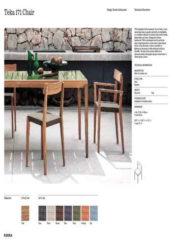 Kvalitní židle Teka je klasickou ukázkou nadčasového designu a zároveň důkazem, že bytelný nábytek z teakového dřeva do venkovních prostor zkrátka neodmyslitelně patří. Židli TEKA pro RODA navrhl Gordon Guillaumier s velkorysými proporcemi, které vám poskytnou dostatek místa i nečekaný komfort. Moderní twist získává židle díky kreativním detailům. Bytelná čtyřnohá podnož se směrem dolů mírně zužuje a pro vynikající stabilitu je drobně zkosená. Jednoduchý teakový opěrák konterastuje se sedákem potaženým odolnou strukturovanou textilií, která je pro vás na výběr v různých barevných odstínech. Vzhledem ke své stohovatelnosti je židle TEKA mimořádně skladná. Kdo by ji nemiloval?
