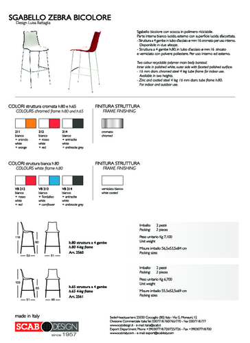 Stohovatelná barová židle ZEBRA BICOLORE z dvoubarevného recyklovatelného polymeru od italské značky SCAB s čtyřnohou podnoží z 16 mm kulaté oceli v pochromované nebo v lakované úpravě. Lakovaná verze je vhodná i do exteriéru. Polykarbonátový sedák a opěrák nabízíme v několika barevných kombinacích dle aktuálního vzorníku. Stohovatelnost umožńuje skládat židle na sebe, šetří tak váš prostor a usnadní manipupaci a uskladnění židlí mimo sezónu. K tomuto účelu skvěle poslouží také praktický přepravní vozík, který lze přiobjednat (viz doplňky). Odolnost těchto židlí je podložena zátěžovým certifikátem CATAS, jsou proto skvělou volbou jak do soukromé kuchyně, tak i do baru či restaurace. Jistě oceníte možnost kombinovat barovou židli s dalšími modely ve stejném designu.