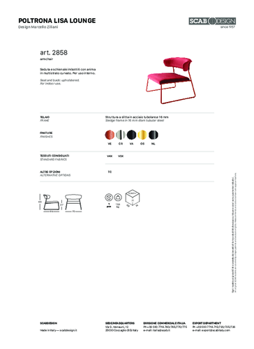 Designové křeslo LISA od italské značky SCAB vyniká originálním oprákem a jemnou ocelovou konstrukcí z oceli v pestré škále povrchových úprav. Čalounění nabízíme v sametu dle aktuálního vzorníku nebo v látce dodané klientem. Stohovatelnost umožńuje skládat křesla na sebe, šetří tak váš prostor a usnadní manipulaci a uskladnění židlí mimo sezónu. K tomuto účelu skvěle poslouží také praktický přepravní vozík, který lze přiobjednat (viz doplňky). Odolnost těchto křesel je podložena zátěžovým certifikátem CATAS, jsou proto skvělou volbou jak do domácnosti, tak i do baru či restaurace. Jistě oceníte možnost kombinovat židli s dalšími modely LISA ve stejném stylu. Křeslo LISA dodáváme i po jednom kuse.