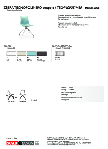 Kolekce židlí ZEBRA TECHNOPOLYMER pro italskou společnost SCAB navrhla designérka Louise Battaglia. Řada je výsledkem spojení několika materiálů. Plastovou skořepinu kombinuje s ocelovou podnoží v několika různých povrchových úpravách. Design celé kolekce působí velmi minimalistickým dojmem, což usnadní ladění s interiérem.