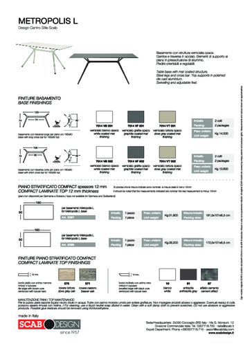 Designový stůl METROPOLIS o výšce 74 cm od italské značky SCAB tvoří obdélníková laminátová deska o velikosti 160x90 cm, která je upevněna na dřevěné nebo kovové podnoži v několika povrchových úpravách. Varianta podnože v lakovaném kovu je vhodná pro venkovní použití. Kromě transparentní stolové desky najdete v naší nabídce také kouřovou nebo vzorovanou variantu. Minimalistický stůl si získá milovníky jednoduchého, ale neokoukaného designu. Odolnost těchto stolů je podložena zátěžovým certifikátem CATAS, jsou proto skvělou volbou jak do domácnosti, tak i do baru či restaurace včetně venkovních prostor. Praktický stolek dodáváme v demontu i po jednom kuse.