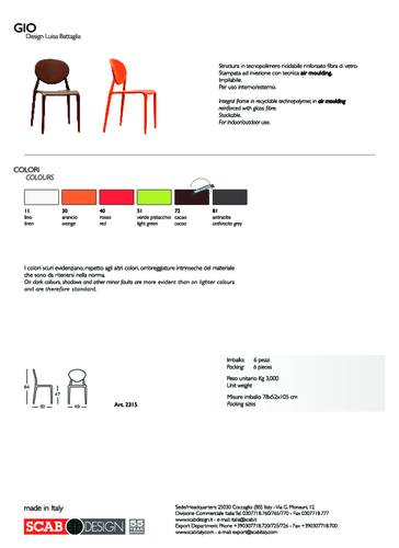 Stohovatelnou židli GIO od italské značky SCAB se skořepinou a čtyřnohou podnoží z recyklovatelného technopolymeru nabízíme v několika odstínech dle aktuálního vzorníku. Stohovatelnost umožńuje skládat židle na sebe, šetří tak váš prostor a usnadní manipupaci a uskladnění židlí mimo sezónu. K tomuto účelu skvěle poslouží také spojovací systém pro podnože a praktický přepravní vozík, který lze přiobjednat (viz doplňky). Odolnost těchto židlí je podložena zátěžovým certifikátem CATAS, jsou proto skvělou volbou jak do soukromé kuchyně, tak i do baru či restaurace. Jistě oceníte možnost kombinovat židli s dalšími modely ve stejném designu. V našem e-shopu najdete také verzi s područkami. Židli dodáváme nejméně po 6 kusech.