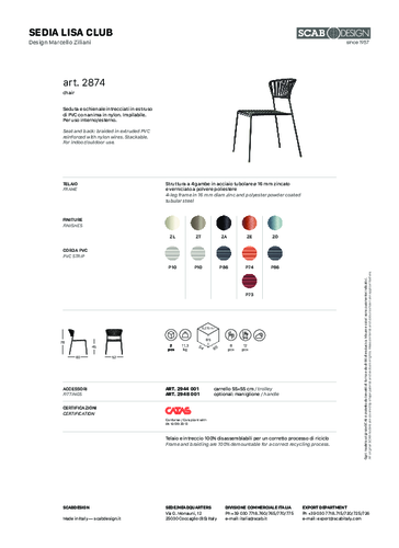 Stohovatelná židle LISA od italské značky SCAB zaujme jemnou ocelovou konstrukcí potaženou technopolymerem, která je originálně propletená vinylovými pásky. Tyto PVC prvky i konstrukci nabízíme v několika barevných provedení dle aktuálního vzorníku. Stohovatelnost umožńuje skládat židle na sebe, šetří tak váš prostor a usnadní manipulaci a uskladnění židlí mimo sezónu. K tomuto účelu skvěle poslouží také praktický přepravní vozík, který lze přiobjednat (viz doplňky). Odolnost těchto židlí je podložena zátěžovým certifikátem CATAS, jsou proto skvělou volbou jak do domácnosti, tak i do baru či restaurace. Jistě oceníte možnost kombinovat židli s dalšími modely LISA ve stejném stylu. Židli dodáváme i po 2 kusech.