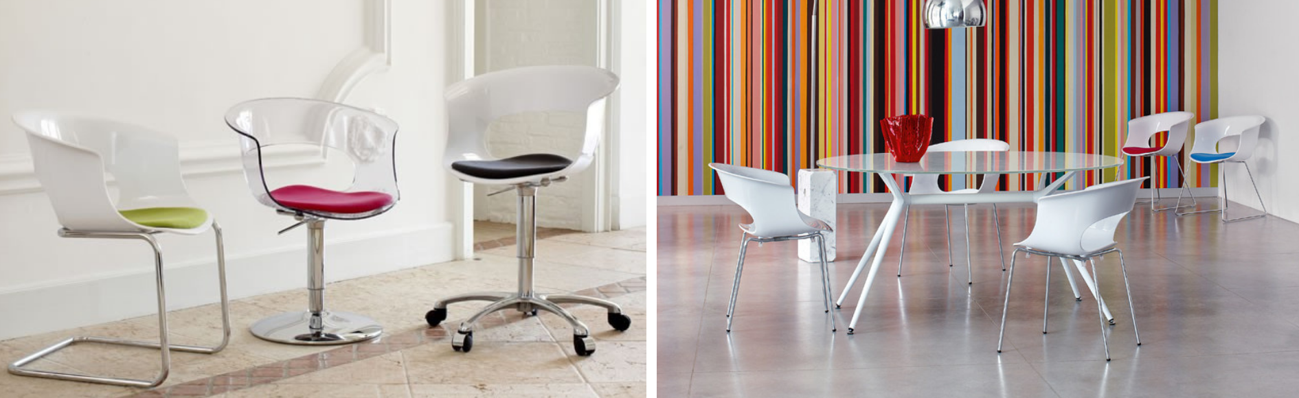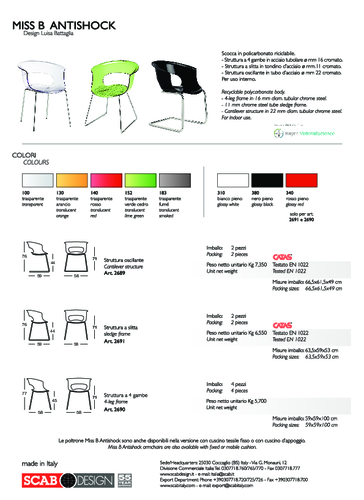 Elegantní židle MISS B ANTISHOCK od italského výrobce SCAB s chromovanou konzolovou podnoží. Skořepina je z recyklovatelného a nárazuvzdorného polykarbonátu v bílé nebo transparentní barvě. Pro ještě vyšší komfort lze přiobjednat pohodlný textilní podsedák ve dvou barevných provedení. Designová skořepina je upevněna na kovové ližinové podnoži. Produkt je ideální jak pro domácnost, tak pro veřejné prostory. Odoslnost těchto židlí je podložena zátěžovým certifikátem CATAS, jsou proto skvělou volbou jak do domácí kuchyně, tak i do kavárny či restaurace. Jistě oceníte možnost kombinovat židli s dalšími modely ve stejném designu. Tento model nabízíme také s kovovou čtyřnohou nebo ližinovou podnoží.