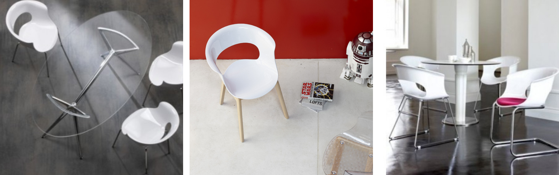 Battaglia si také pohrává s různými druhy materiálů podnoží, přičemž sedací základ tvoří recyklovatelná polykarbonátová skořepina. Kombinace polykarbonátu s jinými materiály vytváří z pouhé židle vizuálně zajímavý objekt. Nábytek se díky svému originálnímu designu přizpůsobí jakémukoli prostředí, hodí se kupříkladu jako vybavení restaurace, kavárny či soukromých prostorů.