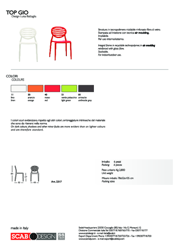 Stohovatelnou židli TOP GIO od italské značky SCAB se skořepinou a čtyřnohou podnoží z recyklovatelného technopolymeru nabízíme v několika odstínech dle aktuálního vzorníku. Od modelů GIO se liší provedením opěráku. Stohovatelnost umožńuje skládat židle na sebe, šetří tak váš prostor a usnadní manipupaci a uskladnění židlí mimo sezónu. K tomuto účelu skvěle poslouží také spojovací systém pro podnože a praktický přepravní vozík, který lze přiobjednat (viz doplňky). Odolnost těchto židlí je podložena zátěžovým certifikátem CATAS, jsou proto skvělou volbou jak do soukromé kuchyně, tak i do baru či restaurace. Jistě oceníte možnost kombinovat židli s dalšími modely ve stejném designu. Židli dodáváme nejméně po 6 kusech.