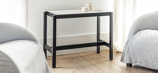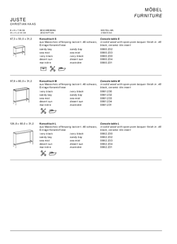 Designový konzolový stolek JUSTE si oblíbíte pro jeho nadčasový design. Robustní stabilní podnož stolku je vyrobena z černě lakovaného masivního dřeva s otevřenými póry. Deska stolu z keramické dlaždice je k dispozici v 5 barvách dle vašeho výběru. Keramika je velice odolná vůči vodě, teplu a snadno se udržuje. Díky svému kompaktnímu zpracování působí vzdušně, vytváří volný prostor a je ideální do úzkých chodeb či dalších místností včetně koupelny. Konzolový stolek JUSTE je vhodný nejen do moderních interiérů, ale také do kancelářských či hotelových prostorů. Dodejte svému interiéru nádech minimalismu.