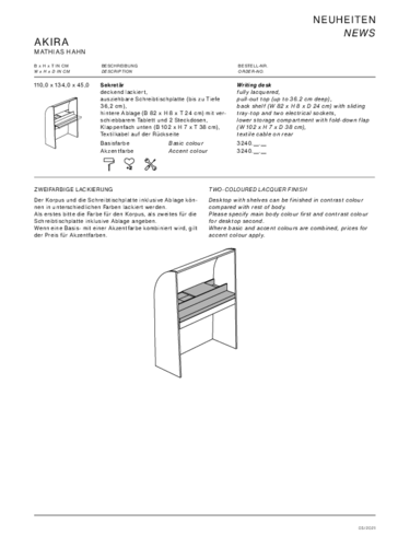Stůl, který kombinuje kouzlo tradičních sekretářů a moderního minimalismu v zářivých barvách. Pohodlnou práci na větší ploše umožňuje praktický skládací mechanismus. Bohatý úložný prostor pod výsuvnou deskou představuje ideální místo pro váš notebook a další nástroje, psací potřeby můžete uložit do speciálních uzavíratelných přihrádek. Pod pevnou poličkou se ukrývají dvě elektrické zásuvky. Stůl AKIRA nabízíme v celé řadě barevných provedení s matným finišem. Korpus a pracovní desku si navíc můžete zvolit v odlišné barvě. Vytvoříte si tak originální a hravý pracovní koutek, do kterého se budete každý den těšit!