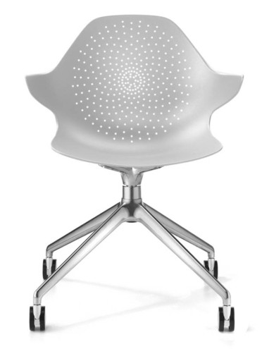 Designová otočná židle KLERA s područkami a kolečky potěší každého, kdo pro svou domácnost nebo kancelář hledá neokoukaný nábytek s výraznou osobitostí. Židle KLERA s nevšedním zdobením působí až psychedelickým dojmem a zaručeně si pro sebe vydobyde veškerou pozornost. Model doporučujeme pro moderní interiér. Stojí na centrální otočné kovové podnoži na čtyřramenném kříži. Pro dokonalou mobilitu je zakončena vybranám typem koleček. Nabízíme ji v několika odstínech laků nebo v chromované verzi. Korpus sedáku a opěráku taktéž z lakovaného kovu v odstínu dle výběru je bohatě tvarován. Opěrák je kontrastně zdoben filigránským motivem a po stranách z něho vystupují praktické područky. Židli KLERA využijete domů, do kanceláře i konferenčních místností. Model u nás najdete také se standardní podnoží.