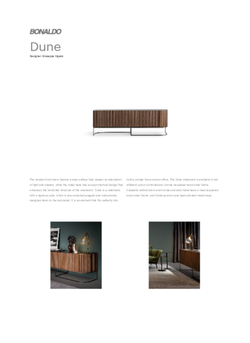 Dizajnová skrinka DUNE je elegantná nízka komoda v retro štýle minulých desaťročí, ktorá nájde široké uplatnenie v jedálňach, obývacích izbách alebo aj v kancelárii. Štíhly kovový podstavec efektne kopíruje zvlnenú líniu skrine. Korpus drevenej skrinky s efektnými posuvnými dverami s lamelami je k dispozícii v 2 rôznych prevedeniach. Skriňa DUNE má 3 oddelené priehradky. Vo vnútri nájdete 2 x 2 police a jednu väčšiu priehradku. Dizajnová skriňa DUNE s nadčasovým retro vzhľadom nikdy nevyjde z módy.