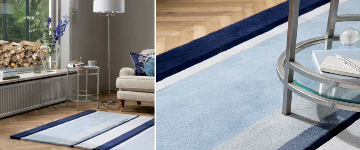 Štýlový koberec EATON - SEASPRAY sa bez problémov hodí do každého moderného interiéru. Tento minimalistický model pôsobí veľmi priamočiaro vďaka motívu pruhov rôznej hrúbky. Dodáva sa v univerzálnej škále modrých odtieňov, ktoré možno ľahko zladiť s akýmkoľvek existujúcim nábytkom. Koberec EATON - SEASPRAY je ručne tkaný z novozélandskej vlny a viskózy najvyššej kvality. Vďaka tomu je veľmi mäkký, zamatový na dotyk a nestráca intenzitu farieb. Hodí sa napríklad k pohovke v obývacej izbe. Tento model si môžete vybrať zo 4 rozmerov alebo v konkrétnej veľkosti podľa vašich potrieb.