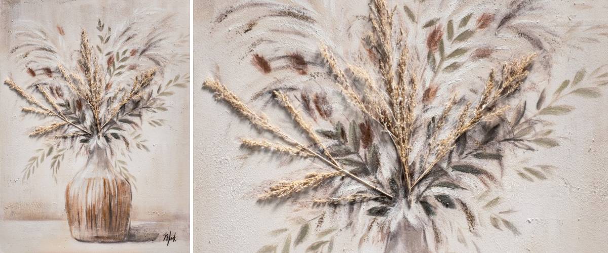 Štýlový obraz W946 90x120 cm je ďalším nádherným kúskom, ktorý vás bude tešiť každý deň na stene moderného aj klasického interiéru. Obrazy Bubola e Naibo ručne maľujú umelci z celého sveta. Na vertikálnom plátne v tvare obdĺžnika je zobrazené zátišie s vázou naplnenou lúčnymi kvetmi. Je vyvedený v zemitých jesenných tónoch na béžovom pozadí, ktoré sa veľmi ľahko kombinuje s akýmikoľvek doplnkami a nábytkom. Pozoruhodný je aj zrnitý povrch maľby, ktorý zvyšuje autentickosť tohto diela. Vstúpte do svojho domova alebo kancelárie s umením, ktoré inšpiruje a povznáša dušu. Plátno si môžete objednať bez rámu alebo s rámom podľa vlastného výberu z katalógu.