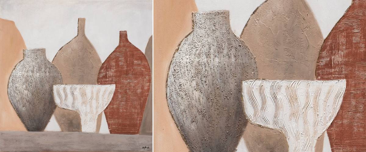 Štýlový obraz W954 100 x 100 cm je ďalším nádherným kúskom, ktorý vás bude tešiť každý deň na stene moderného aj klasického interiéru. Obrazy Bubola e Naibo ručne maľujú umelci z celého sveta. Na plátne štvorcového tvaru sú zobrazené džbány a misy v zemitých odtieňoch hnedej, okrovej a béžovej farby. Tieto farby sa dajú ľahko zladiť s akýmkoľvek príslušenstvom a nábytkom. Pozoruhodná je aj sochárska štruktúra povrchu maľby, ktorá jej dodáva na autenticite. Vneste do svojho domova alebo kancelárie umenie, ktoré inšpiruje a povznáša dušu. Obraz si môžete objednať bez rámu alebo s rámom podľa vlastného výberu z katalógu.