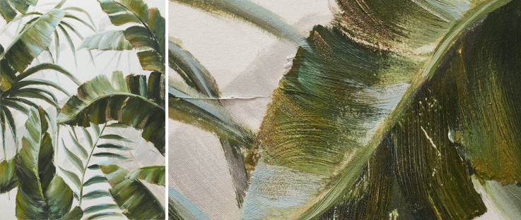 Pôsobivý obraz W827 90x120 s detailmi palmových listov vnesie do vášho domova nádych exotiky. Vďaka svojej koncepcii vynikne najmä v moderných interiéroch. Diela sú ručne maľované na plátno profesionálnymi umelcami, takže každý kus je originál a uspokojí aj náročných klientov. Vďaka akrylovým farbám v kombinácii s inými materiálmi má obraz zaujímavú štruktúru s plastickým efektom. Akrylové farby sú známe svojou farebnou stálosťou, takže maľba bude váš interiér zdobiť v nezmenenej podobe mnoho rokov. Obraz je možné objednať s rôznymi typmi rámov, ktoré sa hodia k vášmu interiéru. K obrazu je priložený certifikát potvrdzujúci, že ide o originál.