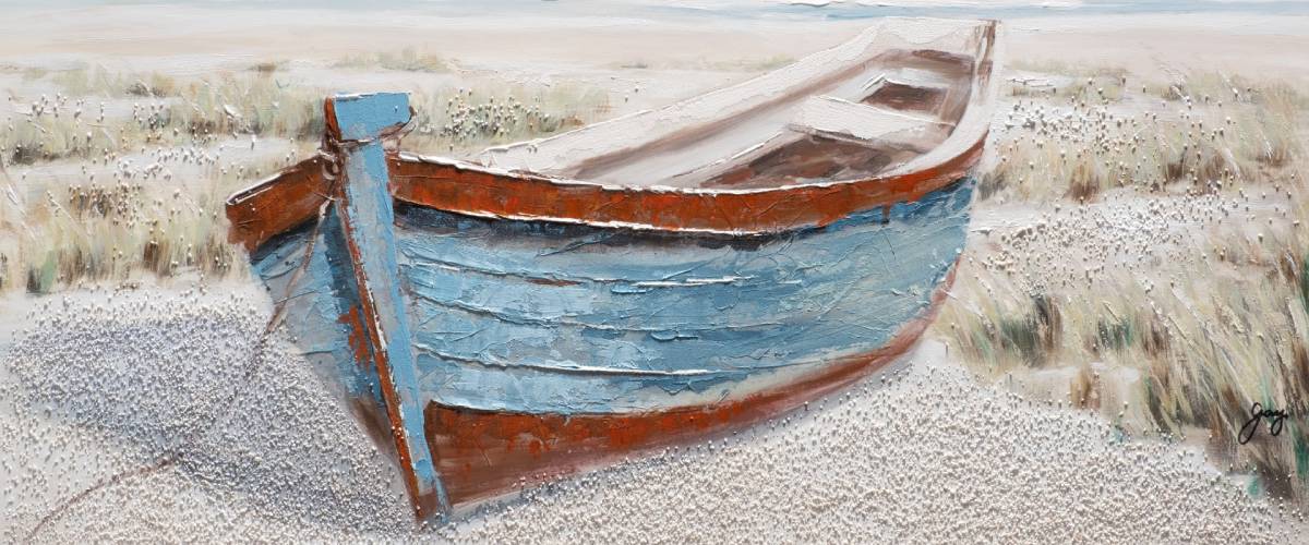 Štýlový obraz W962 60x120 cm vás zahrnie pozitívnymi emóciami, kedykoľvek sa naň pozriete. Môžete sa z neho tešiť každý deň na stene klasického alebo moderného interiéru. Obrazy Bubola e Naibo ručne maľujú umelci z celého sveta. Plátno v tvare obdĺžnika zobrazuje drevenú loďku umiestnenú na piesočnatej pláži na pobreží mora. Je vyvedený v elegantne decentných a tlmených vodných tónoch, ktoré sa budú v priestore krásne vynímať. Pozoruhodná je aj jemná štruktúra povrchu, ktorá dodáva obrazu na autenticite. Vložte do svojho domova alebo kancelárie umenie, ktoré inšpiruje a povznáša dušu. Plátno si môžete objednať bez rámu alebo s rámom podľa vlastného výberu z katalógu.