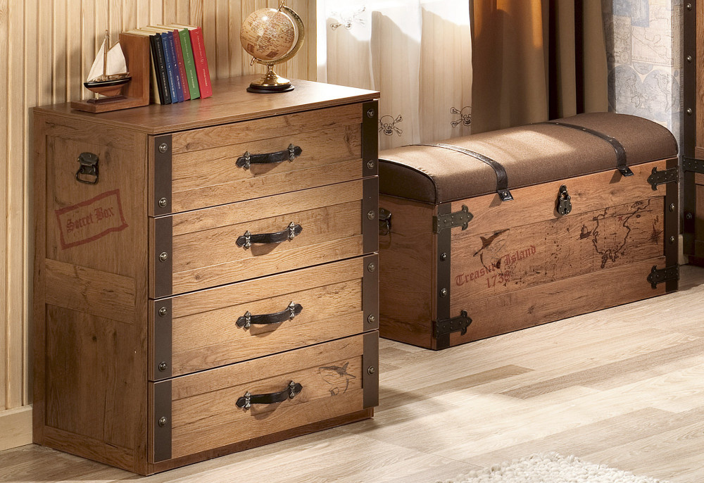 Každý pirát potrebuje miesto, kde si môže ukryť svoje poklady, a komoda PIRÁT je na tento účel ideálna. Komoda ponúka štyri priestranné zásuvky s nosnosťou 30 kg a má mnohostranné využitie - či už do nej uložíte oblečenie, hračky, školské potreby alebo čokoľvek iné, určite sa vám bude hodiť. Zásuvky majú bezpečnostný zámok, ktorý zabraňuje ich úplnému vysunutiu, a úchyty sú vyrobené z umelej kože.
