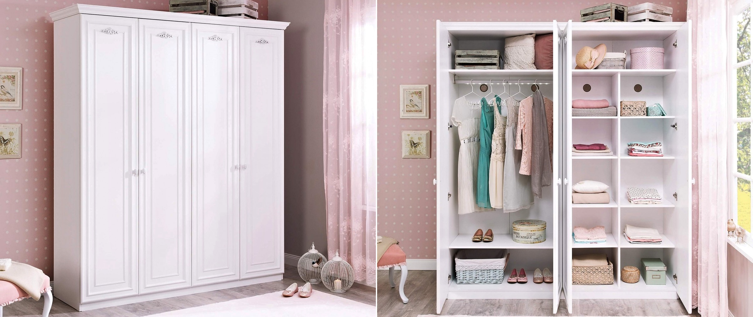 Má vaše dievčatko veľa oblečenia, doplnkov a iných nevyhnutností, ktoré potrebuje niekam schovať? Potom je pre ňu ideálna štvordverová šatníková skriňa ROMANTICA s tichým zatváraním. Šatníková skriňa má police a šatníkovú tyč s LED osvetlením. Kvalitné vyhotovenie sa veľmi ľahko udržiava, čo v detskej izbe oceníte. Vďaka bielej farbe sa veľmi ľahko kombinuje s ostatnými doplnkami. Krásne bude vyzerať v kombinácii s púdrovo ružovou alebo námorníckou modrou.