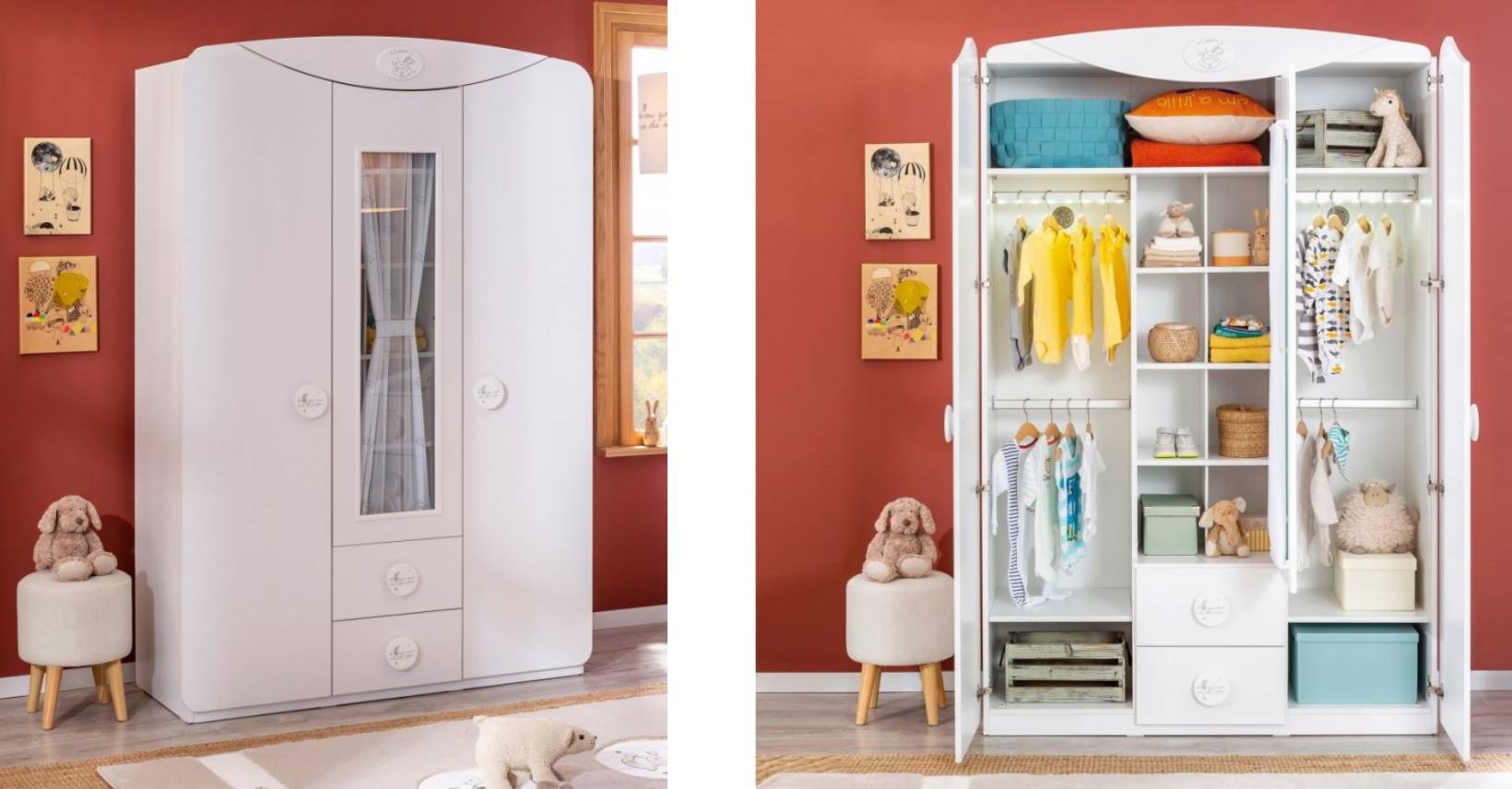 Táto elegantná skriňa vám zaručí dostatok úložného priestoru v detskej izbe. Jeho vnútorné členenie umožňuje maximálne využitie! Je rozdelená na policovú a šatníkovú časť, kde sa okrem iného nachádza šatníková tyč s praktickým LED osvetlením, police rôznych veľkostí alebo dve zásuvky.