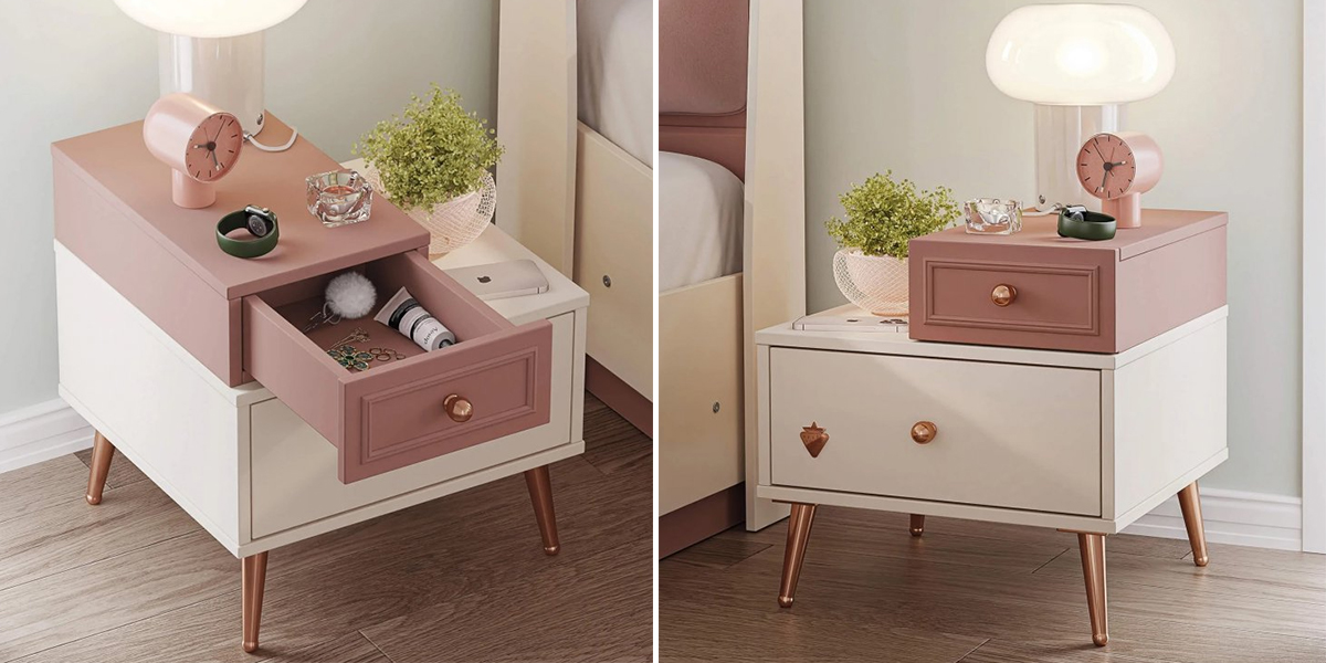 Nočný stolík ELEGANCE poskytuje priestor na všetky potrebné veci a stolnú lampu. Má dve zásuvky, z ktorých väčšia má tlmený doraz. Menšia je voľne zasunutá, vhodnejšia na drobnosti. Nočný stolík je vyrobený z MDF dosky v krémových a ružových odtieňoch. Kovové nohy a úchyty sú lakované ružovým zlatom. Tento elegantný kus nábytku bude sprevádzať vaše dievčatko počas celého detstva a pri správnom výbere doplnkov aj dlhšie!
