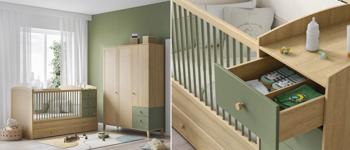 Kolekcia LOOF BABY vás zaujme na prvý pohľad. Vyznačuje sa krásnym nadčasovým dizajnom inšpirovaným škandinávskym štýlom, ktorý dopĺňa prútené dekorácie s neutrálnymi odtieňmi dreva a zelenej. Táto kolekcia je vhodná pre každého, či už čakáte dievčatko alebo chlapčeka. Vďaka neutrálnym farbám môžete izbu zariadiť v predstihu, nestane sa, že by ste ružovú premenili na modrú a naopak. Jednoducho, s kolekciou LOOF BABY ste pripravení na všetko. Kolekcia zahŕňa, samozrejme, postieľky pre malé bábätká, ale aj skrinky či police.