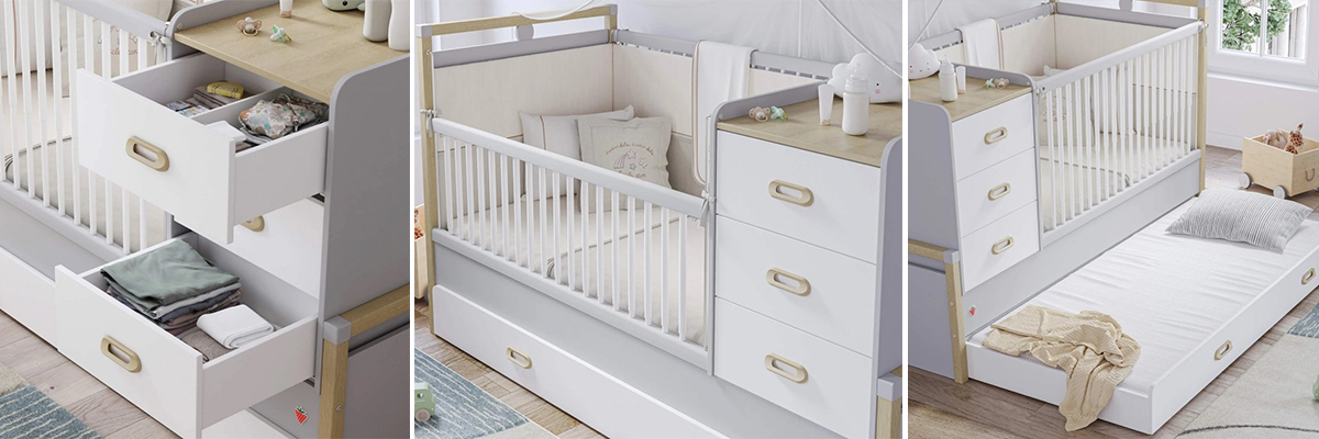 Detská postieľka, prebaľovací pult a úložný priestor v jednom kuse. MINO BABY ponúka riešenie od bábätka až po raný tínedžerský vek. Spočiatku slúži ako detská postieľka s rozmermi 80 x 130 cm. Hneď vedľa nej sa nachádza prebaľovací pult s tromi zásuvkami. V spodnej časti postele nájdete výsuvnú zásuvku, ktorá po umiestnení matraca môže slúžiť aj ako prístelka, na ktorú si môžete príležitostne ľahnúť. Keď už vaše dieťa prebaľovací pult nepotrebuje, celú posteľ možno demontovať. Vznikne tak detská posteľ s rozmermi 80 x 177 cm, malá komoda a polička. Tento kus je vyrobený z MDF, má doskový rošt a pohyblivú bočnicu. Stavte teda na multifunkčnosť a štýl!