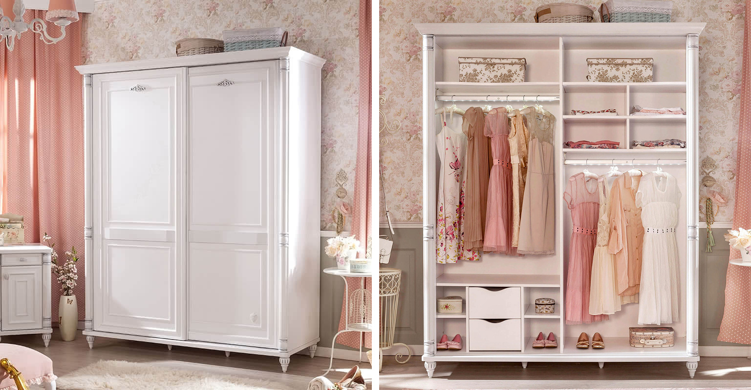 Nemáte príliš veľkú izbu pre svoju mladú dámu? Potom je pre vás ideálna šatníková skriňa ROMANTIC s posuvnými dverami. Vďaka tomuto typu dverí sa nemusíte starať o to, či bude otvor zasahovať do iných kusov nábytku alebo iného vybavenia. Vďaka kvalitnému kovaniu zvládnu manipuláciu s dverami aj malé deti a môžu si do nich uložiť všetok svoj šatník. O poriadok sa stará rozmanité usporiadanie interiéru. V šatníku nájdete dve šatníkové tyče s LED osvetlením, menšie a väčšie police a dve zásuvky na drobnú bielizeň.