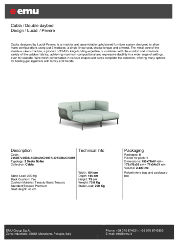Rozmanitosť tvarov a objemov, hravé krivky a maximálne pohodlie. To sú výrazy, ktoré opisujú manželskú posteľ CABLA navrhnutú spoločnosťou Lucidi-Pevere. Tento kúsok je vyrobený z nehrdzavejúcej ocele v niekoľkých odtieňoch laku, ktorý si poradí so všetkými vrtochmi počasia. Podrúčky a operadlo sú vyrobené z ľahkého drôteného pletiva. Mäkké čalúnenie je čalúnené štandardnou alebo prémiovou látkou, ktorá odoláva vlhkosti aj slnečnému žiareniu. Poťahy sú snímateľné a jednotlivé vankúše sú k sebe pripevnené pomocou suchých zipsov. Ak hľadáte dokonalý kúsok na súkromnú terasu alebo možno do reštaurácie na pláži, CABLA je ten pravý. Preskúmajte celú modulárnu kolekciu pre kompletné vybavenie. Pomocou jednotlivých prvkov si môžete navrhnúť vlastné sedenie na mieru.
