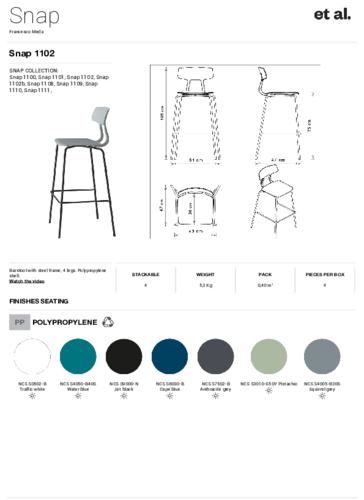 Ak hľadáte tú správnu barovú stoličku, prestaňte hľadať - našli ste tú správnu. Vysoká barová stolička SNAP je výrobok pozostávajúci z kombinácie polypropylénových a oceľových rúrok, ktoré tvoria konštrukciu so sedadlom a operadlom. Sedadlo je spojené s operadlom atypickými ramenami, vďaka čomu je konštrukčne a esteticky flexibilné a ľahké. Vďaka širokej škále podstavcov a viacerým farbám sedadla a operadla sa dá prispôsobiť akémukoľvek prostrediu. Vďaka svojmu nadčasovému dizajnu je barová stolička SNAP ideálna pre rafinované interiérové a exteriérové projekty - od barov a kaviarní až po osobné priestory.