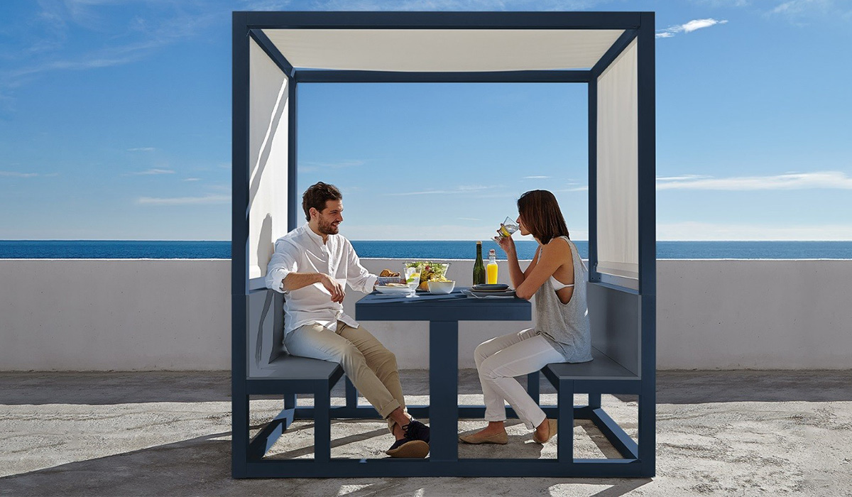Letné popoludnia a večery pod holým nebom patria k najkrajším chvíľam. Altánok MERENDERO, ktorý navrhol dizajnér José Antonio Gandía-Blasco, bol vytvorený práve pre tieto chvíle stretnutia. Pozostáva z elegantnej konštrukcie z práškovo lakovaného hliníka v mnohých dostupných odtieňoch vrátane zlatej povrchovej úpravy a látkových zásten v rôznych farbách na ochranu pred slnečnými lúčmi. Na pohodlné sedenie slúžia čalúnené lavice. Tie môžu byť jednofarebné alebo pruhované, čo im dodáva stredomorský nádych. Táto komplexná pergola je vhodná pre súkromné záhrady aj komerčné objekty s intenzívnou prevádzkou. Za každých okolností však zabezpečí bezstarostnú atmosféru a dokonalý štýl.