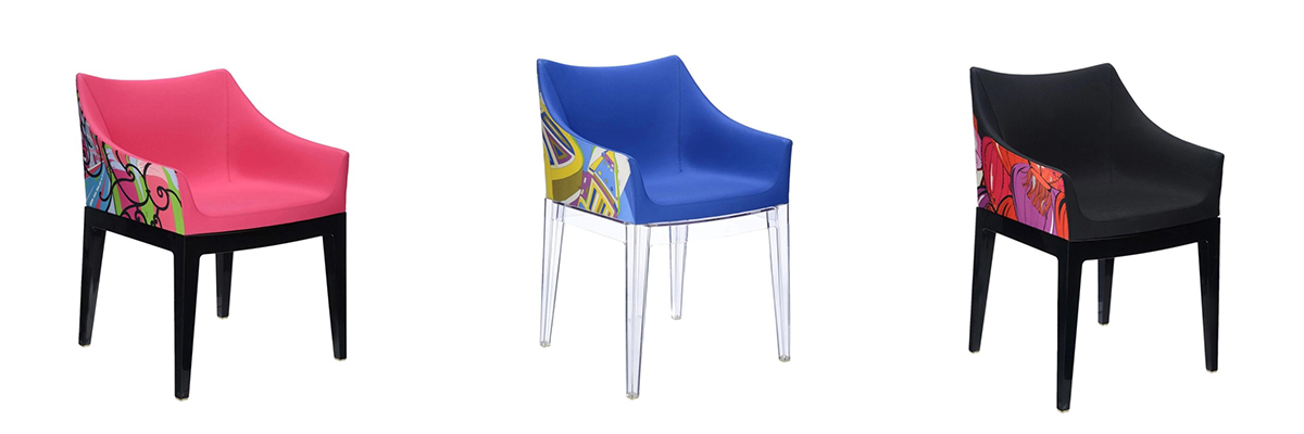 Značka Kartell prichádza s čalúneným kreslom pod značkou známeho dizajnéra Phillipa Starcka. Predstavujeme stoličku MADAME inšpirovanú abstraktnými mestskými motívmi z limitovanej edície potlače šálov módneho domu Pucci. Farebnú škrupinu čalúnenú látkou vo viacerých farbách dopĺňa podstavec z priehľadného alebo farebného polykarbonátu. Tento model oživí každý verejný alebo súkromný interiér. Jeho rozmery sú 54 x 53 cm x 80 cm (šírka x hĺbka x výška).