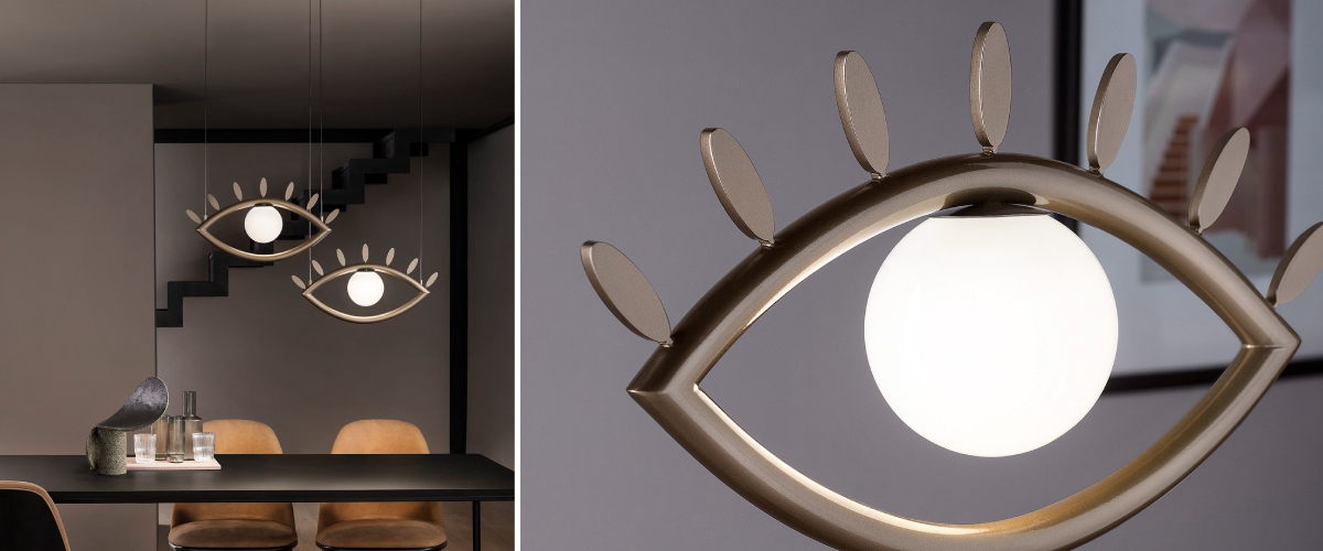 Dizajnové závesné svietidlo VISIO S M1 dodá vášmu modernému interiéru nádych skutočnej originality a nevšednosti. Chcete upútať pozornosť? Potom je to ideálna voľba do domácností, ale aj kancelárií či komerčných priestorov! Závesné svietidlo v tvare ľudského oka má vertikálny rám zavesený na lanách a predstavuje tvar ľudského ucha. Rám je vyrobený z lakovaného kovu. Dizajn si môžete vybrať v lesklom alebo matnom vyhotovení zo širokej škály farieb. Vo vnútri rámu sa nachádza guľovité svietidlo s mliečnym tienidlom z muránskeho skla. Z kolekcie VISIO nájdete aj ďalšie prvky, pomocou ktorých môžete na stene vytvoriť obrys celej tváre!