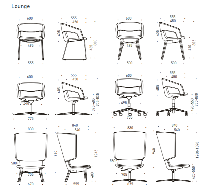 Stoličky a kreslá TWIST&SIT majú sedadlo a operadlo z polypropylénu a sú potiahnuté látkovým alebo koženým čalúnením. Materiál použitý na podstavce sa líši od typu k typu (niektoré podstavce sú kovové, iné drevené alebo plastové).