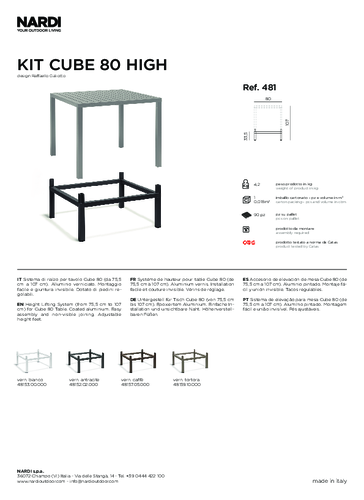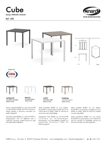 CUBE je rad pevných minimalistických stolov zo živice so štvorcovým povrchom DurelTop. Ide o nový inovatívny systém výroby stolových dosiek vyvinutý s cieľom dosiahnuť najvyššiu úroveň praktickosti, odolnosti a elegancie. Má tiež hliníkovú základňu a konštrukciu, ktorá modelu dodáva stabilitu a robustnosť. Je k dispozícii v dvoch veľkostiach a štyroch farbách. Nábytok NARDI GARDEN je výnimočný aj svojou vysokou kvalitou, ktorá je podporená certifikáciou CATAS pre výrobky určené pre namáhané verejné priestory. Na výrobky sa vzťahuje aj predĺžená záruka 5 rokov, takže ich môžeme odporučiť pre verejné priestory s vysokou návštevnosťou.