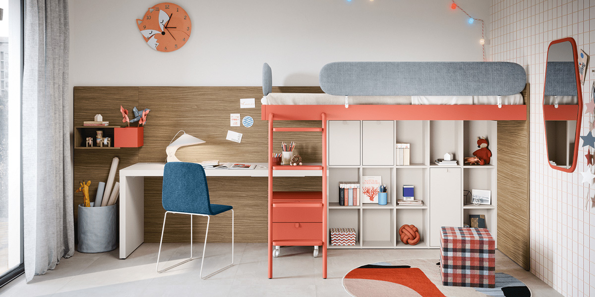 Izba je miestom, kde sa deti hrajú, snívajú, učia sa nové veci a budujú svoju osobnosť. Dokonale zladená zostava nábytku KIDS SPACE 13 bola zostavená tak, aby každý kúsok dával zmysel a vytvoril miesto pre rast detí vo veku 8-12 rokov. Kombinácia neutrálnych odtieňov, koralovej červenej, sivej a modrej s drevenými prvkami bude dokonalým pozadím.