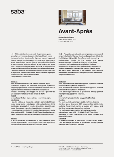 Kolekcia Avant-Après pochádza z hlavy kreatívneho talianskeho dizajnéra Sergia Bicegu. Vyznačuje sa pevnosťou a ľahkosťou a vďaka svojej sofistikovanosti zútulní každý priestor a zároveň ho urobí štýlovým. Obsahuje modulárnu pohovku a praktické odkladacie stolíky. Vďaka výberu jednotlivých kusov si môžete interiér ľahko prispôsobiť svojmu priestoru a štýlu.