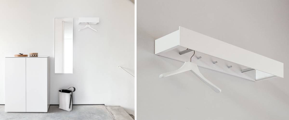 Tento nenápadný biely lakovaný drevený vešiak s jednou alebo dvoma hliníkovými tyčami na zav esenie nájde miesto v každej domácnosti alebo kancelárii. Je k dispozícii v 2 veľkostiach a možno ho doplniť praktickými hliníkovými alebo čiernymi lakovanými háčikmi alebo závesným zrkadlom z kolekcie TRACE, aby ste si mohli každý deň pred odchodom rýchlo skontrolovať svoj vzhľad. Nevyhnutný doplnok do chodieb a vstupných priestorov!