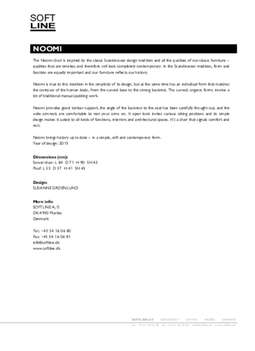 Očarujúca podnožka Noomije inšpirovaná klasickou škandinávskou tradíciou a pochádza z hlavy dánskej dizajnérky Susanne Grønlund. Je praktickým doplnkom kresla z rovnakej kolekcie, ale dá sa používať aj samostatne. Podnožka má oceľovú základňus chrómovou alebo lakovanou (čierno-bielou) povrchovou úpravou a je celočalúnená. Je k dispozícii v širokej škále farieb a materiálov čalúnenia vrátane vami dodanej látky. Na požiadanie je možné stoličku vybaviť špeciálnou povrchovou úpravou vnútorných materiálov na zvýšenie požiarnej odolnosti.