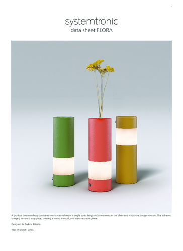 Svietidlo a váza v jednom výrobku. FLORA prináša prírodu a dizajn do každého priestoru a poskytuje príjemnú atmosféru. Štúdio La Galería Estudio ju navrhlo v niekoľkých farbách. Hliníkovú konštrukciu dopĺňa oceľový podstavec a čierny textilný kábel. Vyberte si teda kúsok, ktorý je krásnou dekoráciou a zároveň prináša prvok osvetlenia.